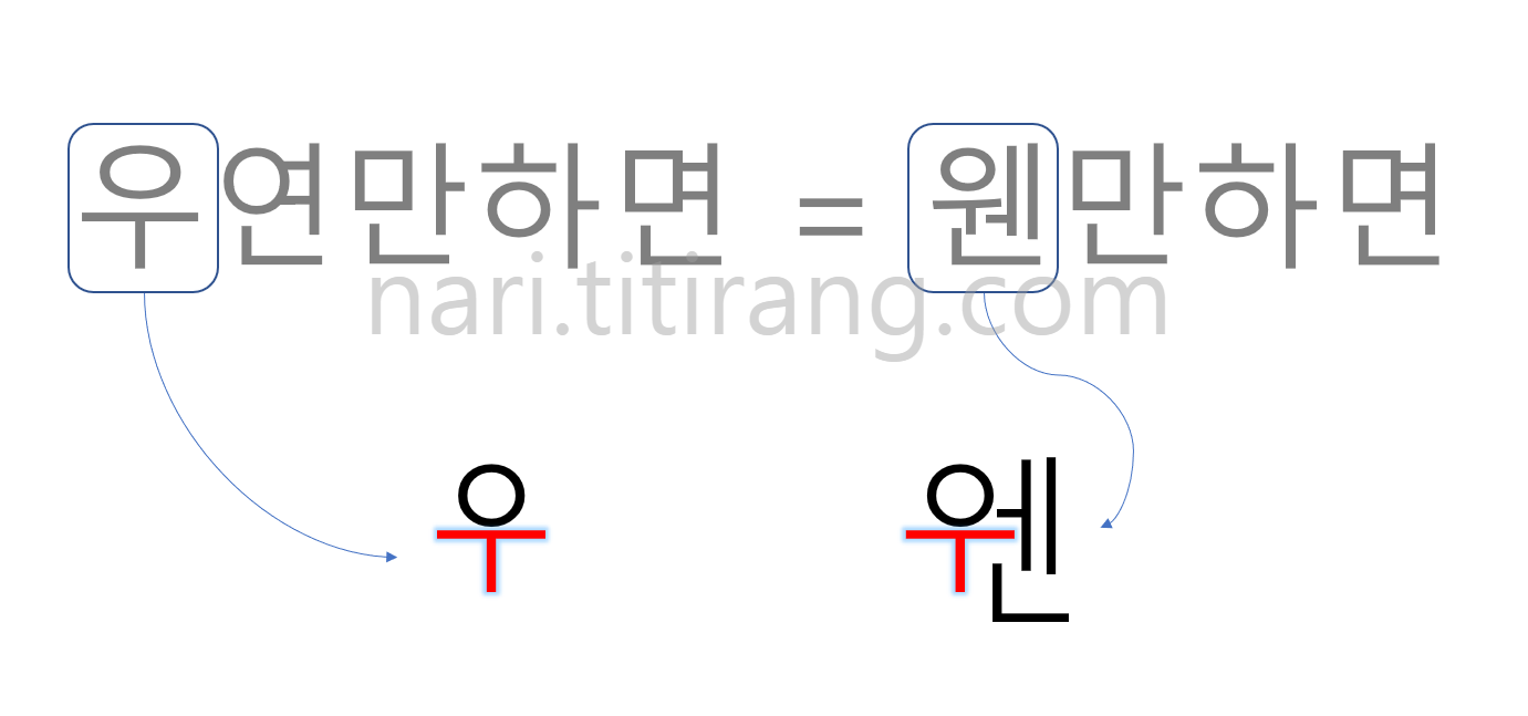 우연만 (ㅇㅜ+ㅇㅕ) -> 웬만 (ㅇㅜㅔㄴ)와 같이 모음 'ㅜ'가 겹치는 걸 기억해두어도 도움이 됩니다.